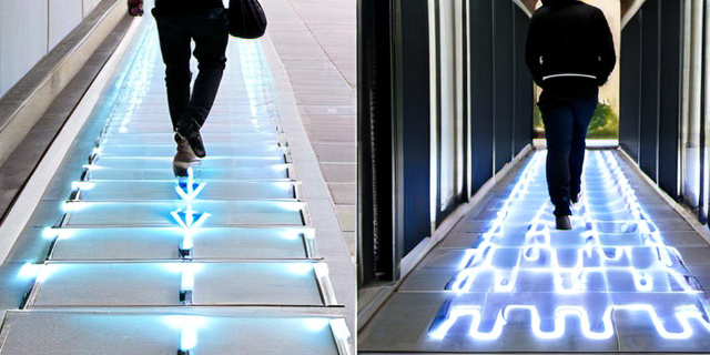 Британская компания Pavegen разработала систему плиток, которые вырабатывают электроэнергию при нажатии, а также фиксируют количество шагов и передают данные в облако для анализа пешеходного трафика.